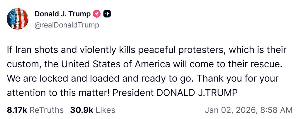 The Western response to events in Iran sounds like so much static. Many reporters and commentators seem unsure, fearful that they might pick the wrong side. As some have pointed out, the left has most egregiously misread the situation, falling into the age-old trap of believing that the enemy of my country is my friend. (It shouldn’t be that hard to let go of this illusion: as one Iranian Instagram user noted, “we can hate Israhell and the Ayatollah at the same time.”) I have the tiniest bit of sympathy for this confusion because of the behavior of the right: over the strident objections of Steve Bannon and America First, President Trump has threatened to “come to the rescue” if the Ayatollah’s government kills peaceful protestors. Unlike the interventions of the Bush and Obama eras, surely Trump sees some specific prize to extract, even if it’s just insider trades on Polymarket.